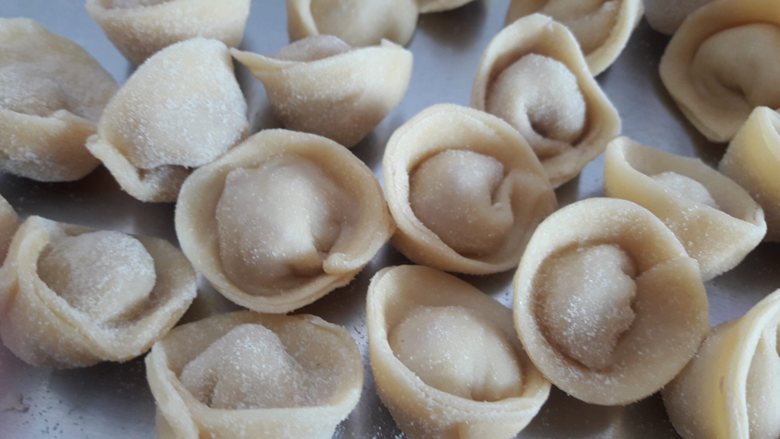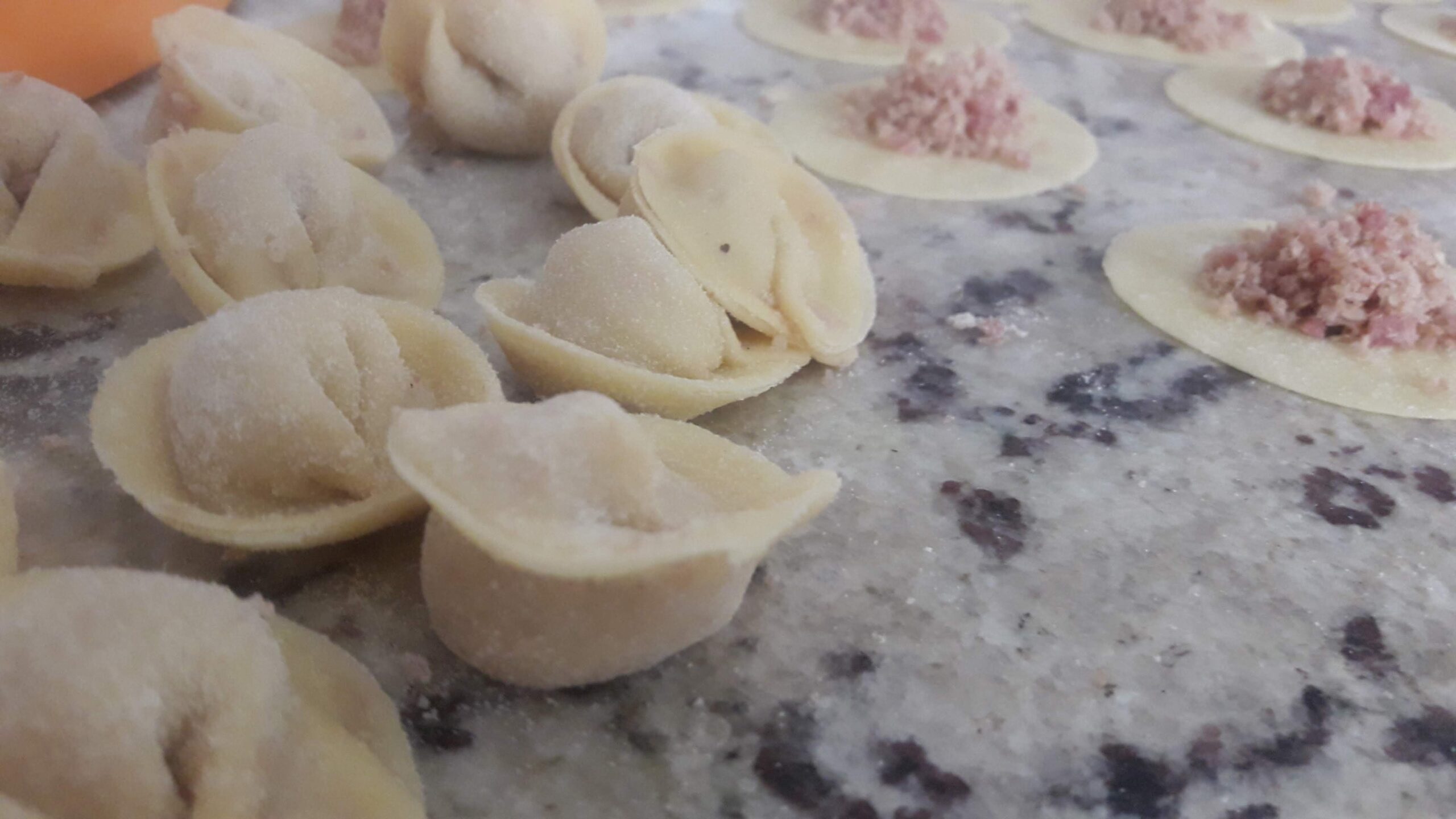 Massa recheada com carnes bovina e suína, salame italiano, parmesão e noz moscada